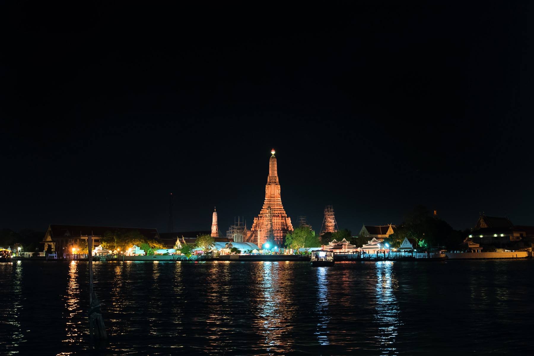 Nächtlicher Chao Phraya mit Blick auf Wat Arun, Bangkok, 2016